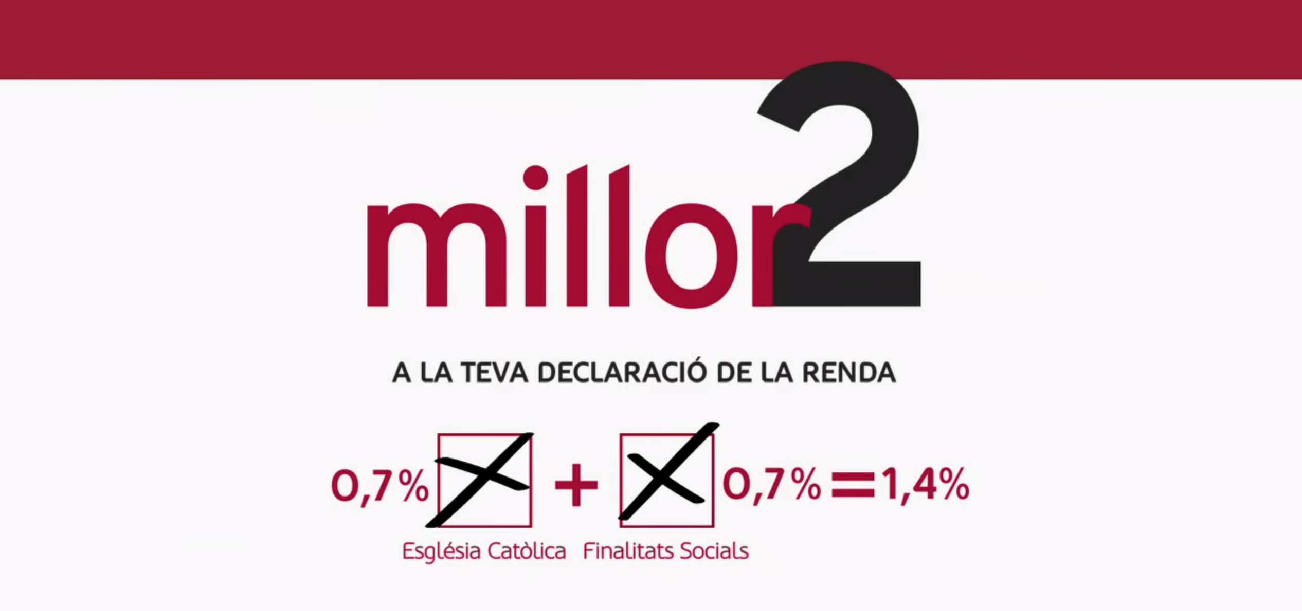 Quan marques conjuntament les caselles “Església catòlica” i “fins socials”, aportes l’1,4% dels teus impostos al sosteniment de l’Església i contribueixes a donar suport a projectes d’atenció a persones en situació de pobresa i exclusió. Recorda que es poden marcar les dues caselles i que no hauràs de pagar més ni et tornaran menys.