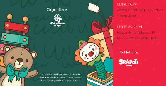 En el marco de la campaña de Navidad de Cáritas «Feliz Navidad, pero para todo el mundo», desde Cáritas Diocesana de Urgell añaden «especialmente para los niños» y animan a colaborar de diferentes formas, ya sea haciendo una aportación de un juguete en buen estado a los diferentes centros de Cáritas o bien a través de una aportación económica, a fin de que las poblaciones del obispado de Urgell ningún niño se quede sin recibir un juego o un juguete esta Navidad. Los juguetes recogidos serán primeramente destinadas a la donación y las restantes pasarán a formar parte del proyecto Puñados Encants. La campaña de recogida de juguetes se hará en los siguientes centros: el Centro Santo Domingo, en Balaguer; el Centro Puigcerdà, en Puigcerdà; el Centro Val de Aran, en Vielha; el Centro Sant Ot, en La Seu d’Urgell y el Centro de los Pallars, en Tremp.